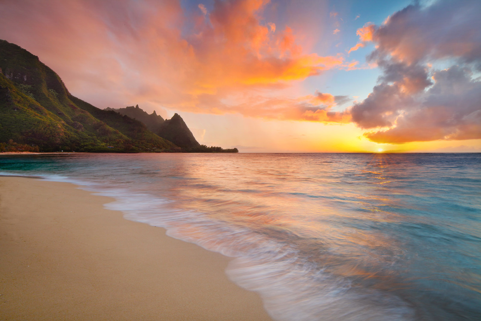 Crescent-shaped Hanalei Bay is a sparkling jewel on the north shore of Kauai, the oldest of the five major Hawaiian islands. The nearly 2 miles of white sand beach and turquoise waters include breath-taking sunsets and a historic pier originally built in 1892. A low-key quiet stretch of the Hawaiian coast, Hanalei Bay was ranked as the No. 1 beach in the United States due to its stunning views, clean tropical water, and laid-back atmosphere.